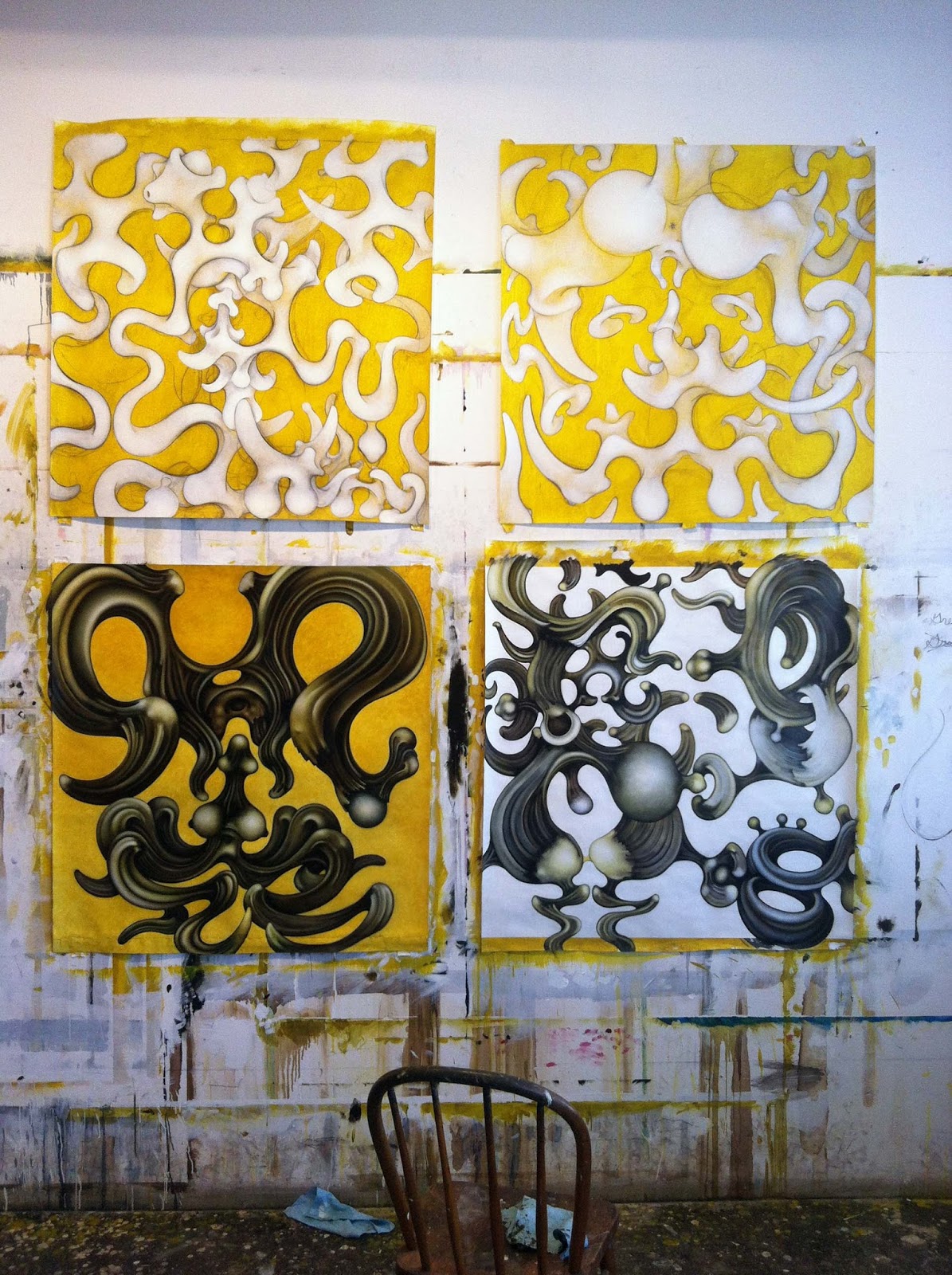 Since I'm up in Northern AZ, Julie (curator at TMA) suggested I contact another artist to see if I could get my painting a ride in his truck. I was excited to find out that it was Michael. I saw his work on a flyer a while back and was attracted to his imagery for obvious reasons. I love the organic gutty sexual shapes, his baroque(ish) style and the scale of his work. These are paintings I look at and think, "Damn I wish I'd thought of that!". So I made sure I got to deliver my painting personally so I could see his work.
